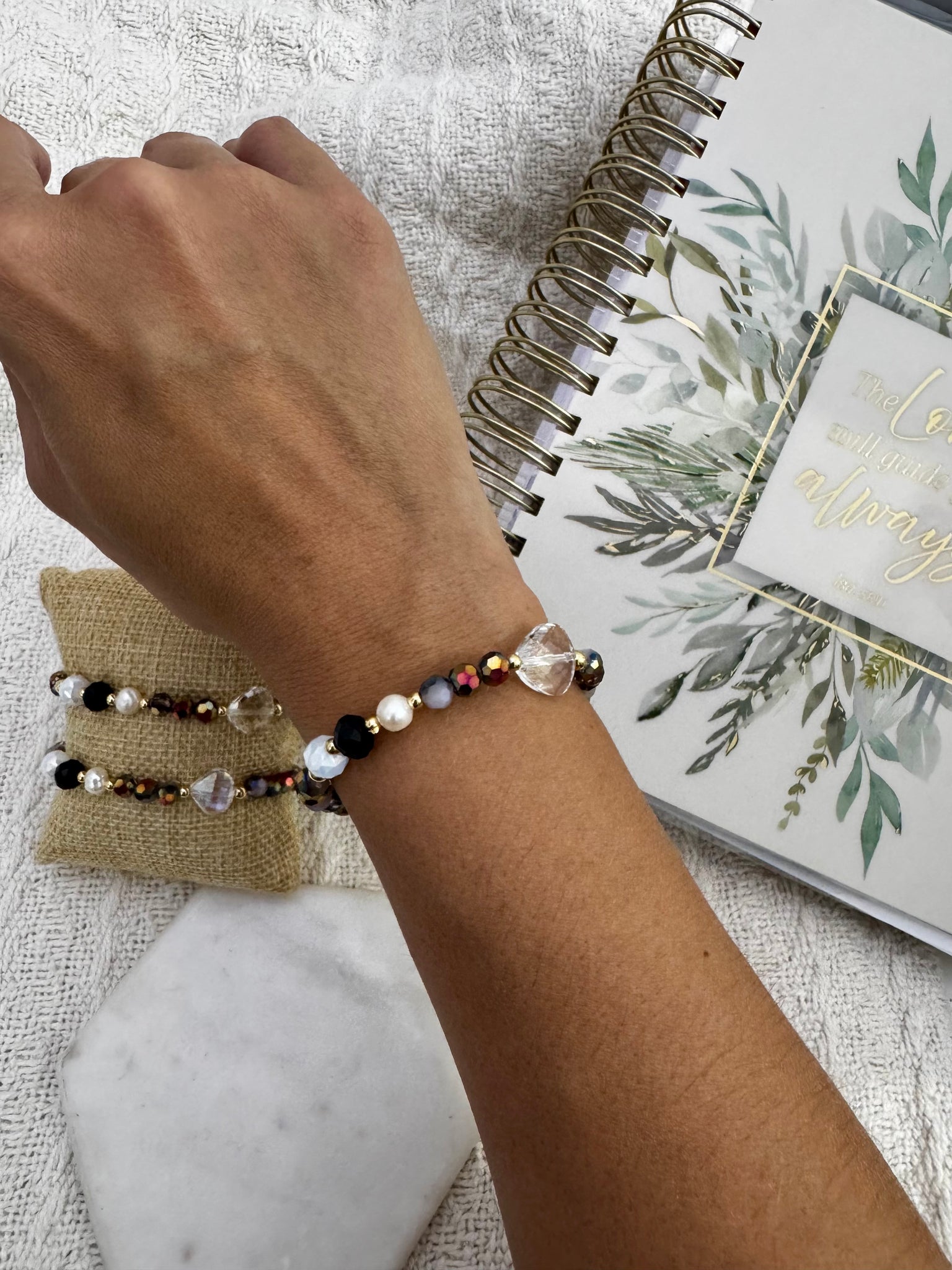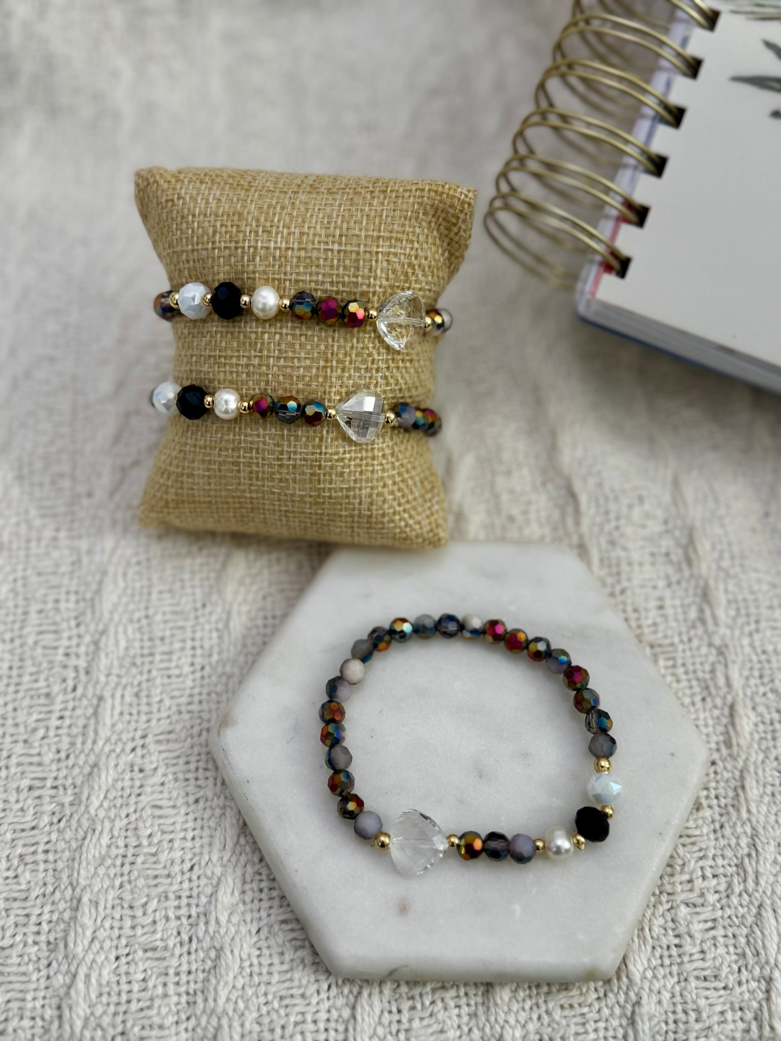 Pulseras elásticas que combinan la belleza natural de cristales y perlas auténticas. Cada pieza brilla con colores tornasoles que cambian según la luz, creando un efecto hipnotizante único. Perfectas para cualquier ocasión, estas pulseras se adaptan cómodamente a tu estilo personal. Siente la energía y sofisticación que solo los materiales naturales pueden ofrecer. Una inversión en belleza que trasciende la moda.