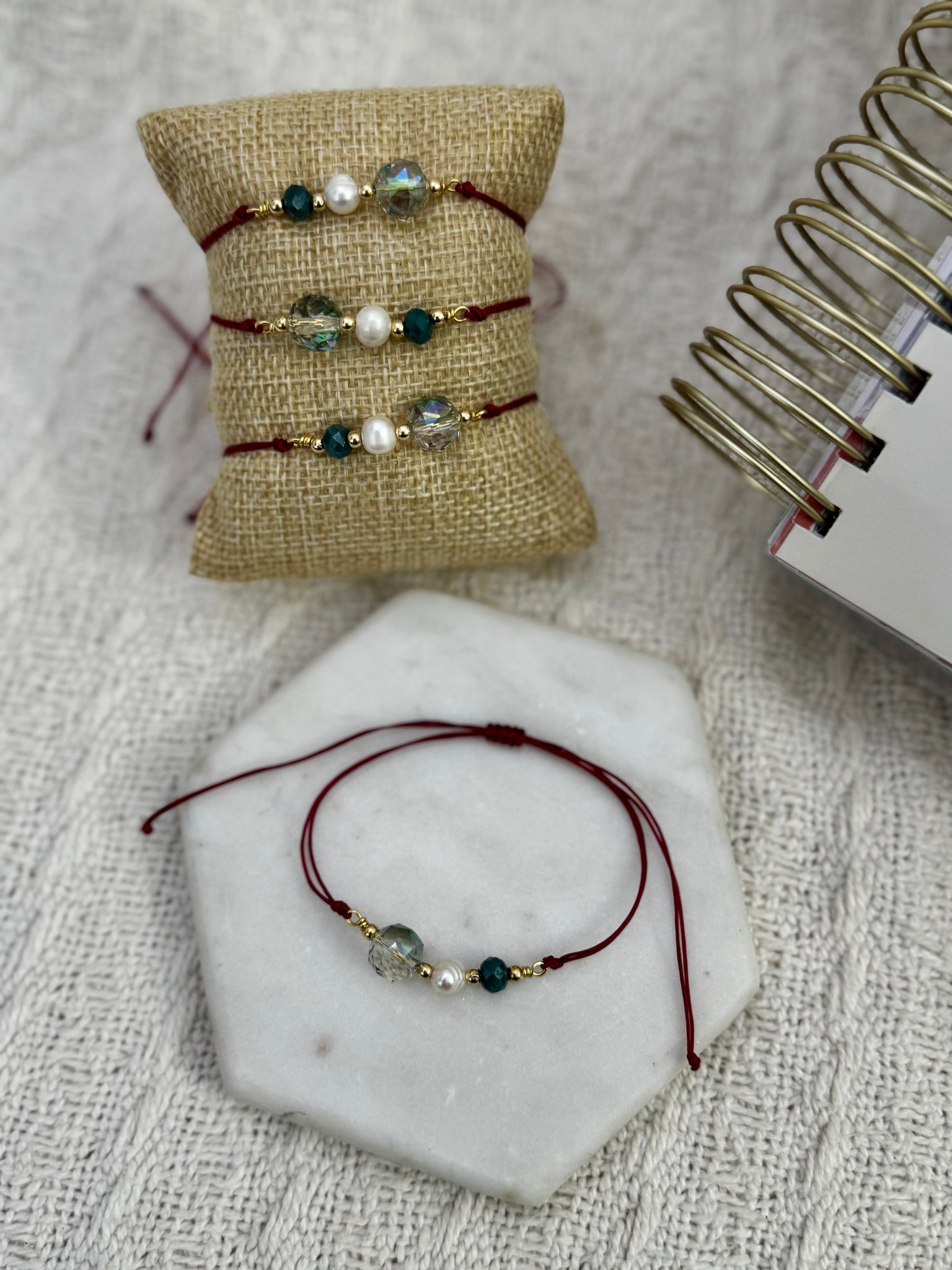 Saam es una pulsera en hilo ajustable nylon, que combina cristales en tonos tornasoles y perlas naturales, el color del hilo es Burgundy un color que esta super trendy desde hace algunos meses. Perfecta para tu diario y realzar tus outfits.