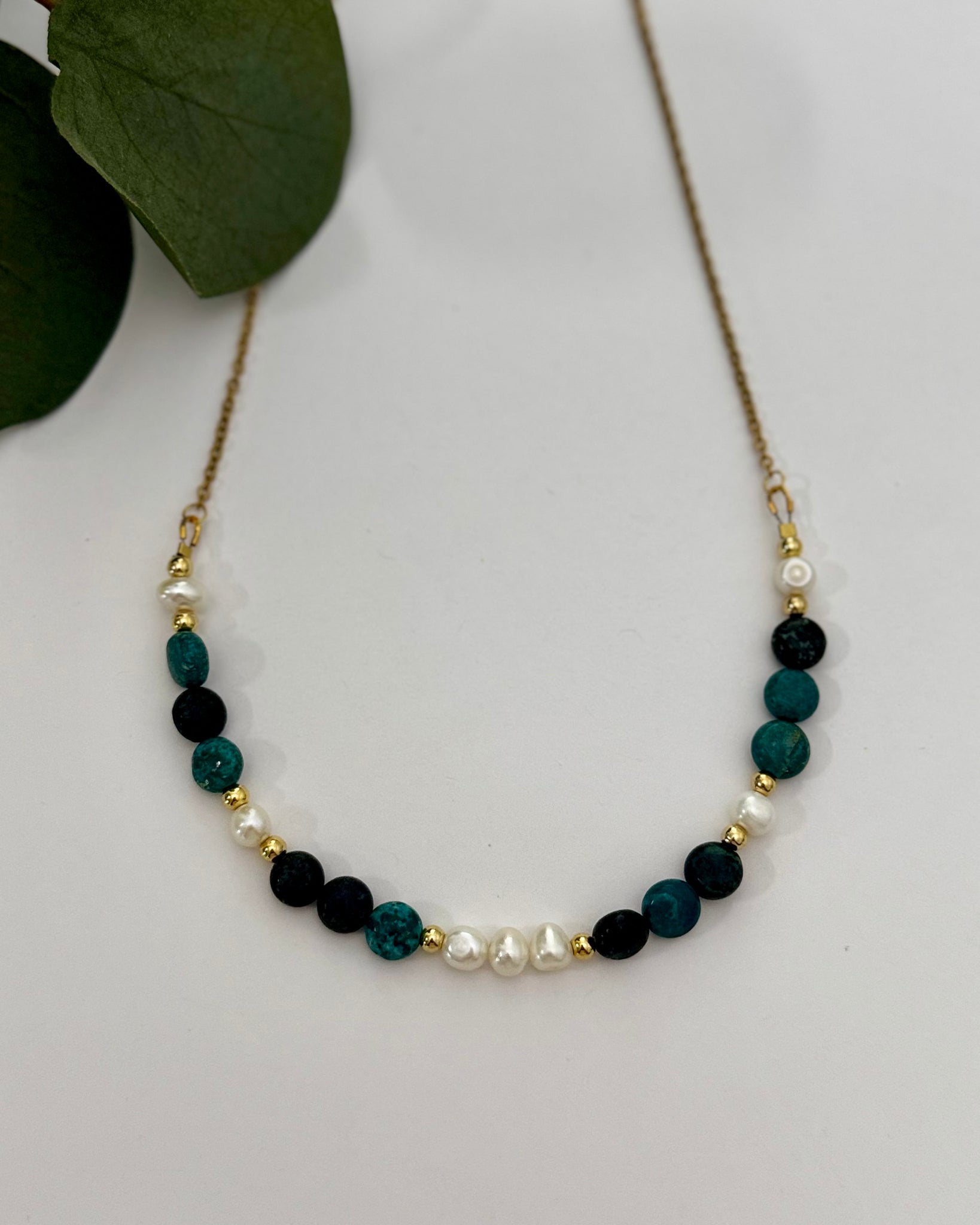 Collar delicado que combina la sofisticación de perlas naturales con la serenidad del apatita azul. Detalles en oro que realzan cada piedra, creando un equilibrio perfecto entre elegancia y versatilidad. Ideal para el día a día, este collar se adapta tanto a looks casuales como a ocasiones especiales. Una pieza atemporal que refleja tu estilo refinado sin pretensiones.